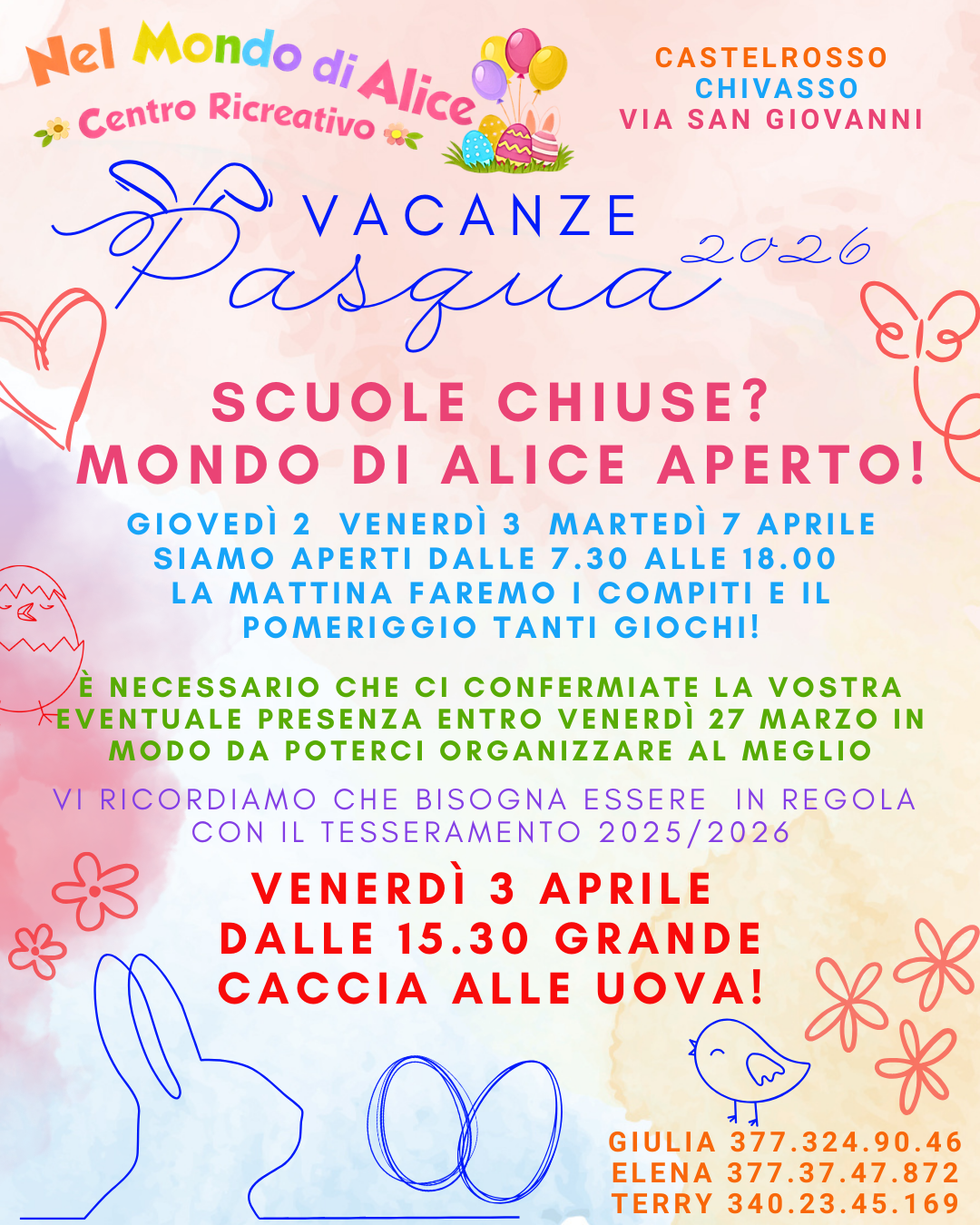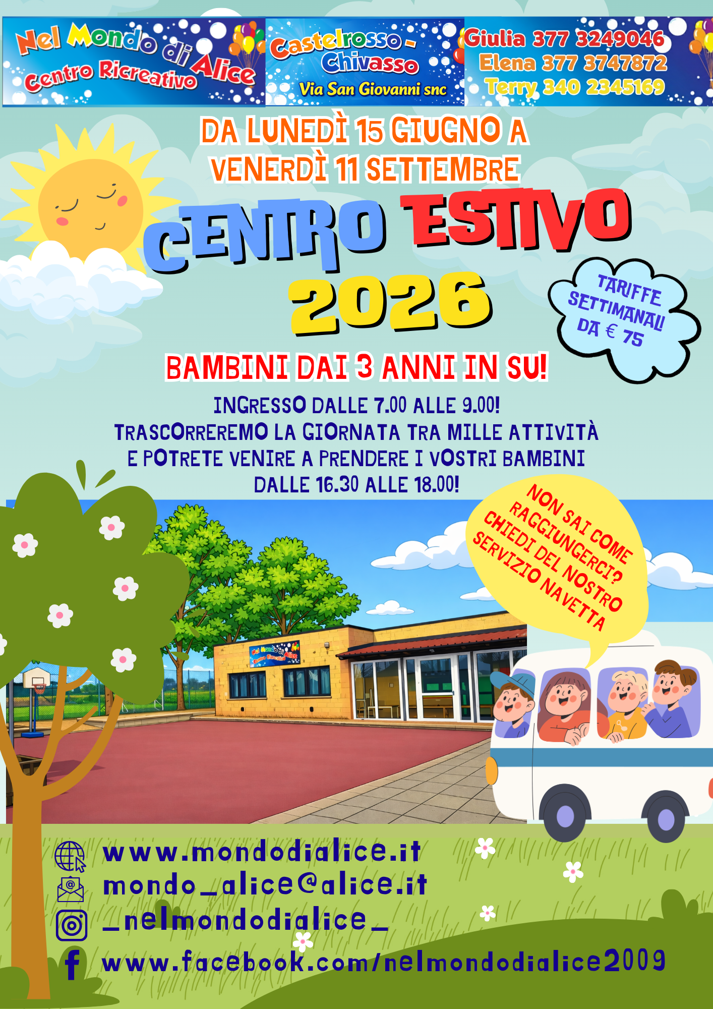 Copertura di tutto il periodo estivo dalla chiusura delle scuole alla riapertura. Servizio da lun. a ven. dalle 07,00 alle 18,00 compreso il pranzo, svolgimento compiti delle vacanze e tutte le attività previste